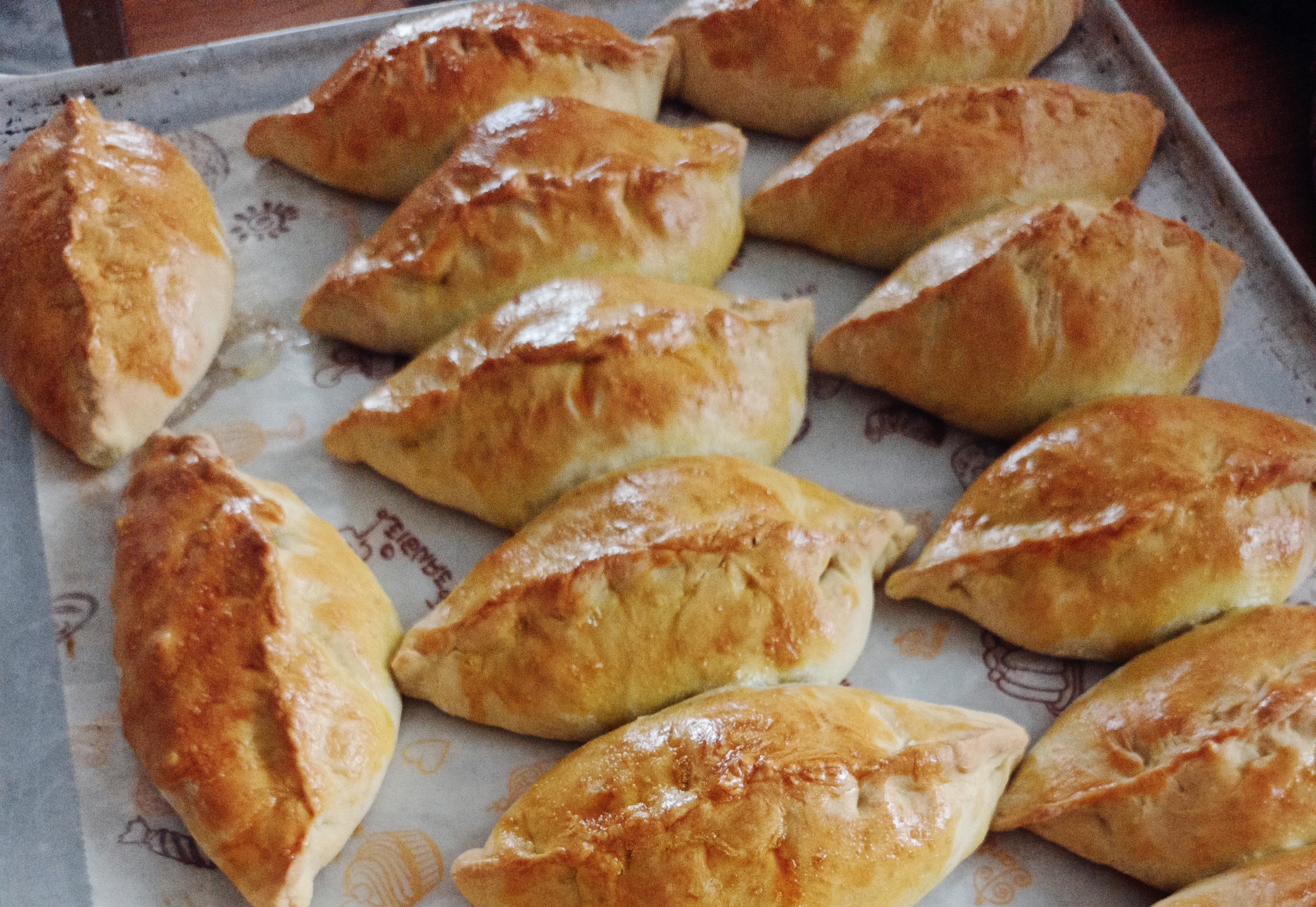 На изображении представлены свежие домашние пирожки, только что вынутые из духовки.