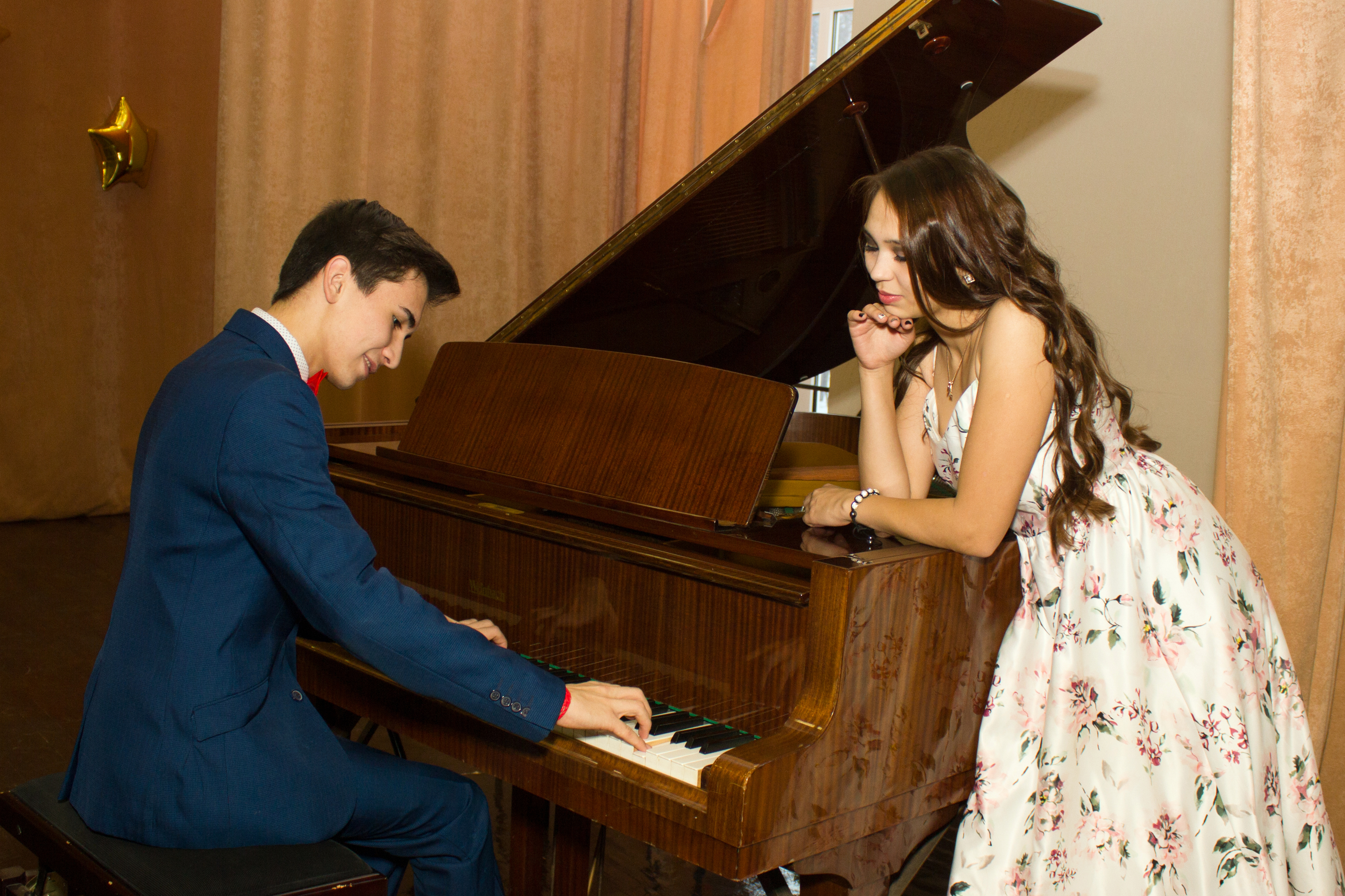 Молодой человек в костюме играет на рояле, рядом девушка в длинном цветочном платье прислонилась к крышке инструмента и внимательно слушает. Тёплый камерный интерьер с занавесами и золотым шаром на фоне — праздничная, романтичная сцена.