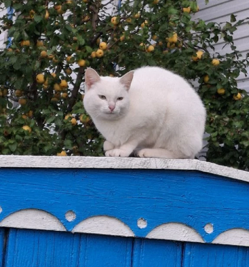 Белая кошка на фоне яблони