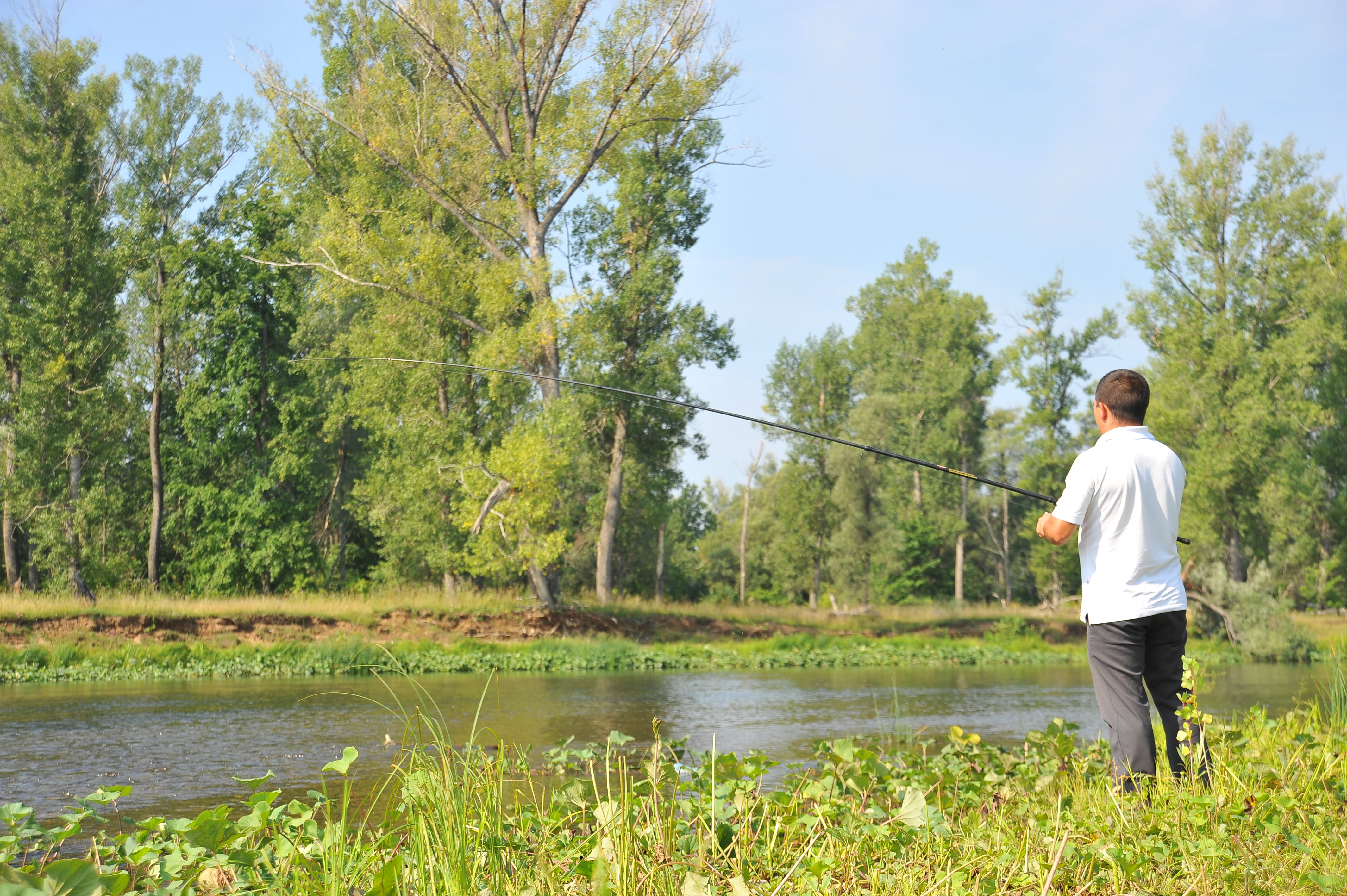 Мужчина со спиннингом ловит рыбу на зелёном берегу спокойной реки в солнечный летний день. На воде заметна плывущая пластиковая бутылка — напоминание о проблеме загрязнения природных водоёмов.